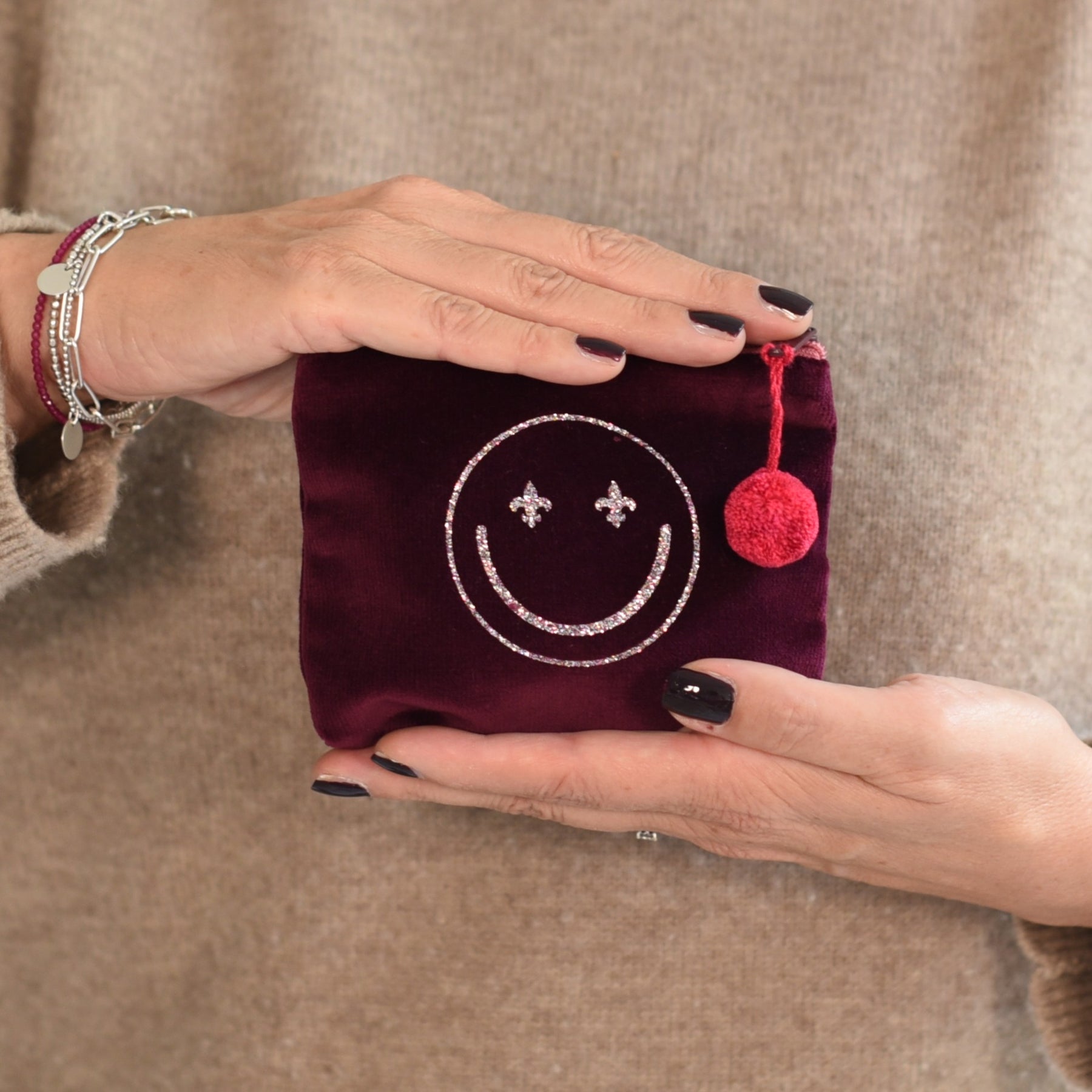 Das samtige Bordeaux bringt Tiefe und Eleganz, der LilienSmiley in ölartigem Schimmer fängt das Licht wunderschön ein. Die passende Bommel in Pink setzt einen charmanten Akzent.